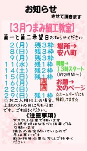 2023年4月3日(月) 大垣桜高校で新高校3年生(4月から生活デザイン科1期生)生徒さんと先生対象に「つまみ細工体験教室」開催 自宅お教室には小学生・中学生・ママさん・大人の方等幅広い年齢層の方達がご参加してくれていま […]